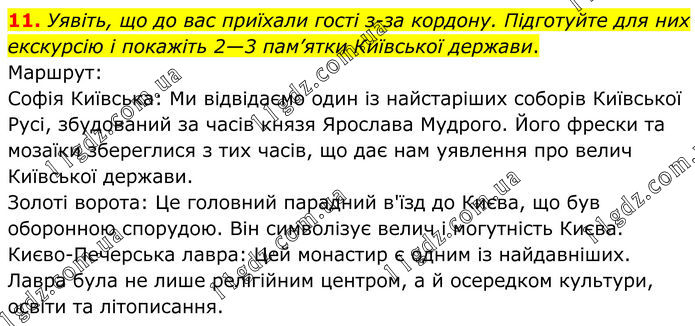 11. Уявіть, що до вас приїхали гості з-за кордону. Підготуйте для них екскурсію і покажіть 2—3 пам’ятки Київської держави. Маршрут: Софія Київська: Ми відвідаємо один із найстаріших соборів Київської Русі, збудований за часів князя Ярослава Мудрого. Його фрески та мозаїки збереглися з тих часів, що дає нам уявлення про велич Київської держави. Золоті ворота: Це головний парадний в'їзд до Києва, що був оборонною спорудою. Він символізує велич і могутність Києва. Києво-Печерська лавра: Цей монастир є одним із найдавніших. Лавра була не лише релігійним центром, а й осередком культури, освіти та літописання.