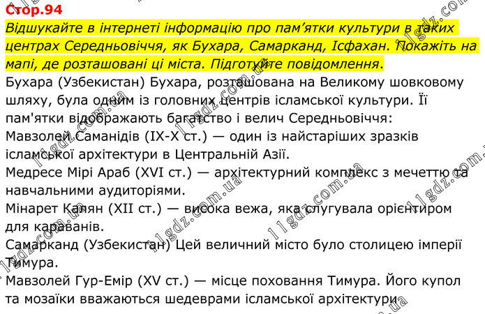 Відшукайте в інтернеті інформацію про пам’ятки культури в таких центрах Середньовіччя, як Бухара, Самарканд, Ісфахан. Покажіть на мапі, де розташовані ці міста. Підготуйте повідомлення. Бухара (Узбекистан) Бухара, розташована на Великому шовковому шляху, була одним із головних центрів ісламської культури. Її пам'ятки відображають багатство і велич Середньовіччя: Мавзолей Саманідів (IX-X ст.) — один із найстаріших зразків ісламської архітектури в Центральній Азії. Медресе Мірі Араб (XVI ст.) — архітектурний комплекс з мечеттю та навчальними аудиторіями. Мінарет Калян (XII ст.) — висока вежа, яка слугувала орієнтиром для караванів. Самарканд (Узбекистан) Цей величний місто було столицею імперії Тимура. Мавзолей Гур-Емір (XV ст.) — місце поховання Тимура. Його купол та мозаїки вважаються шедеврами ісламської архітектури.