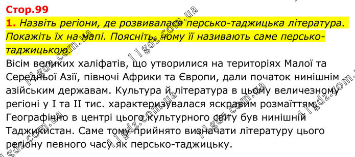 1. Назвіть регіони, де розвивалася персько-таджицька література. Покажіть їх на мапі. Поясніть, чому її називають саме персько-таджицькою. Вісім великих халіфатів, що утворилися на територіях Малої та Середньої Азії, півночі Африки та Європи, дали початок нинішнім азійським державам. Культура й література в цьому величезному регіоні у І та ІІ тис. характеризувалася яскравим розмаїттям. Географічно в центрі цього культурного світу був нинішній Таджикистан. Саме тому прийнято визначати літературу цього регіону певного часу як персько-таджицьку.