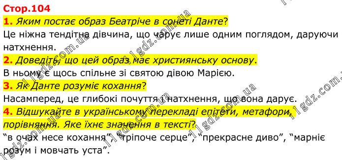 1. Яким постає образ Беатріче в сонеті Данте? Це ніжна тендітна дівчина, що чарує лише одним поглядом, даруючи натхнення. 2. Доведіть, що цей образ має християнську основу. В ньому є щось спільне зі святою дівою Марією. 3. Як Данте розуміє кохання? Насамперед, це глибокі почуття і натхнення, що вона дарує. 4. Відшукайте в українському перекладі епітети, метафори, порівняння. Яке їхнє значення в тексті? “в очах несе кохання”, “тріпоче серце”, “прекрасне диво”, “марніє розум і мовчать уста”.