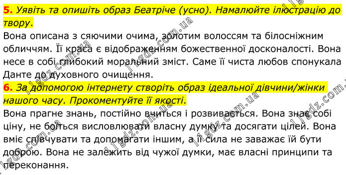 5. Уявіть та опишіть образ Беатріче (усно). Намалюйте ілюстрацію до твору. Вона описана з сяючими очима, золотим волоссям та білосніжним обличчям. Її краса є відображенням божественної досконалості. Вона несе в собі глибокий моральний зміст. Саме її чиста любов спонукала Данте до духовного очищення. 6. За допомогою інтернету створіть образ ідеальної дівчини/жінки нашого часу. Прокоментуйте її якості. Вона прагне знань, постійно вчиться і розвивається. Вона знає собі ціну, не боїться висловлювати власну думку та досягати цілей. Вона вміє співчувати та допомагати іншим, а її сила не заважає їй бути доброю. Вона не залежить від чужої думки, має власні принципи та переконання.