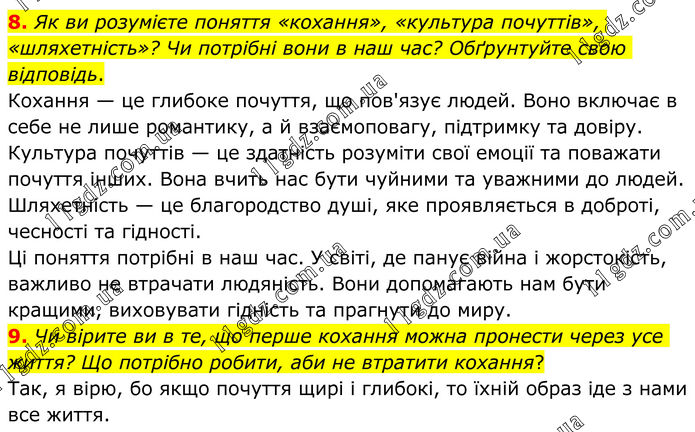8. Як ви розумієте поняття «кохання», «культура почуттів», «шляхетність»? Чи потрібні вони в наш час? Обґрунтуйте свою відповідь. Кохання — це глибоке почуття, що пов'язує людей. Воно включає в себе не лише романтику, а й взаємоповагу, підтримку та довіру. Культура почуттів — це здатність розуміти свої емоції та поважати почуття інших. Вона вчить нас бути чуйними та уважними до людей. Шляхетність — це благородство душі, яке проявляється в доброті, чесності та гідності. Ці поняття потрібні в наш час. У світі, де панує війна і жорстокість, важливо не втрачати людяність. Вони допомагають нам бути кращими, виховувати гідність та прагнути до миру. 9. Чи вірите ви в те, що перше кохання можна пронести через усе життя? Що потрібно робити, аби не втратити кохання? Так, я вірю, бо якщо почуття щирі і глибокі, то їхній образ іде з нами все життя.