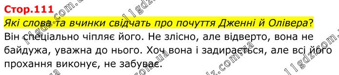 Які слова та вчинки свідчать про почуття Дженні й Олівера? Він спеціально чіпляє його. Не злісно, але відверто, вона не байдужа, уважна до нього. Хоч вона і задирається, але всі його прохання виконує, не забуває.