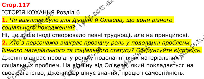 ІСТОРІЯ КОХАННЯ Розділ 6 1. Чи важливо було для Дженні й Олівера, що вони різного соціального походження? Ні, це лише іноді створювало певні труднощі, але не принципові. 2. Хто з персонажів відіграє провідну роль у подоланні проблеми їхнього матеріального та соціального статусу? Обґрунтуйте відповідь. Дженні відіграє провідну роль у подоланні їхніх матеріальних і соціальних проблем. На відміну від Олівера, який покладається на своє багатство, Дженніфер цінує знання, працю і самостійність.