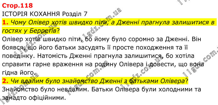 ІСТОРІЯ КОХАННЯ Розділ 7 1. Чому Олівер хотів швидко піти, а Дженні прагнула залишитися в гостях у Берретів? Олівер хотів швидко піти, бо йому було соромно за Дженні. Він боявся, що його батьки засудять її просте походження та її поведінку. Натомість Дженні прагнула залишитися, бо хотіла справити гарне враження на родину Олівера і довести, що вона гідна його. 2. Чи вдалим було знайомство Дженні з батьками Олівера? Знайомство було невдалим. Батьки Олівера були холодними та занадто офіційними.