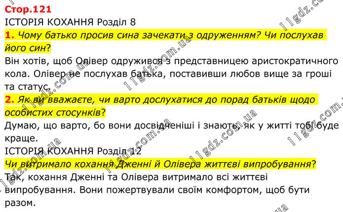ІСТОРІЯ КОХАННЯ Розділ 8 1. Чому батько просив сина зачекати з одруженням? Чи послухав його син? Він хотів, щоб Олівер одружився з представницею аристократичного кола. Олівер не послухав батька, поставивши любов вище за гроші та статус. 2. Як ви вважаєте, чи варто дослухатися до порад батьків щодо особистих стосунків? Думаю, що варто, бо вони досвідченіші і знають, як у житті тобі буде краще. ІСТОРІЯ КОХАННЯ Розділ 12 Чи витримало кохання Дженні й Олівера життєві випробування? Так, кохання Дженні та Олівера витримало всі життєві випробування. Вони пожертвували своїм комфортом, щоб бути разом.