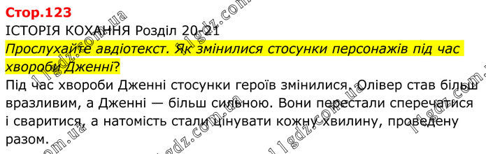 ІСТОРІЯ КОХАННЯ Розділ 20-21 Прослухайте авдіотекст. Як змінилися стосунки персонажів під час хвороби Дженні? Під час хвороби Дженні стосунки героїв змінилися. Олівер став більш вразливим, а Дженні — більш сильною. Вони перестали сперечатися і сваритися, а натомість стали цінувати кожну хвилину, проведену разом.