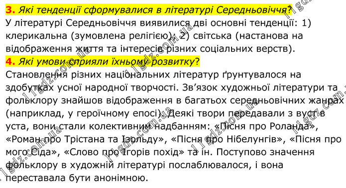 3. Які тенденції сформувалися в літературі Середньовіччя? У літературі Середньовіччя виявилися дві основні тенденції: 1) клерикальна (зумовлена релігією); 2) світська (настанова на відображення життя та інтересів різних соціальних верств). 4. Які умови сприяли їхньому розвитку? Становлення різних національних літератур ґрунтувалося на здобутках усної народної творчості. Зв’язок художньої літератури та фольклору знайшов відображення в багатьох середньовічних жанрах (наприклад, у героїчному епосі). Деякі твори передавали з вуст в уста, вони стали колективним надбанням: «Пісня про Роланда», «Роман про Трістана та Ізольду», «Пісня про Нібелунгів», «Пісня про мого Сіда», «Слово про Ігорів похід» та ін. Поступово значення фольклору в художній літературі послаблювалося, і вона переставала бути анонімною.