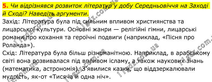 5. Чи відрізнявся розвиток літератур у добу Середньовіччя на Заході й Сході? Наведіть аргументи. Захід: Література була під сильним впливом християнства та лицарської культури. Основні жанри — релігійні гімни, лицарські романи про кохання та героїчні подвиги (наприклад, «Пісня про Роланда»). Схід: Література була більш різноманітною. Наприклад, в арабському світі вона розвивалася під впливом ісламу, а також наукових знань (математика, астрономія). З'явилися казки, що віддзеркалювали мудрість, як-от «Тисяча й одна ніч».