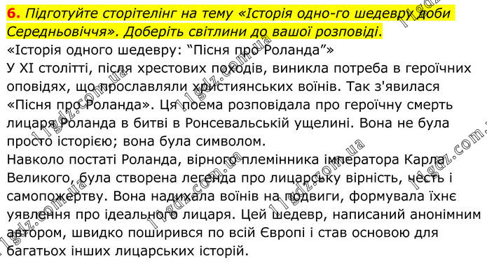 6. Підготуйте сторітелінг на тему «Історія одно-го шедевру доби Середньовіччя». Доберіть світлини до вашої розповіді. «Історія одного шедевру: “Пісня про Роланда”» У XI столітті, після хрестових походів, виникла потреба в героїчних оповідях, що прославляли християнських воїнів. Так з'явилася «Пісня про Роланда». Ця поема розповідала про героїчну смерть лицаря Роланда в битві в Ронсевальській ущелині. Вона не була просто історією; вона була символом. Навколо постаті Роланда, вірного племінника імператора Карла Великого, була створена легенда про лицарську вірність, честь і самопожертву. Вона надихала воїнів на подвиги, формувала їхнє уявлення про ідеального лицаря. Цей шедевр, написаний анонімним автором, швидко поширився по всій Європі і став основою для багатьох інших лицарських історій.
