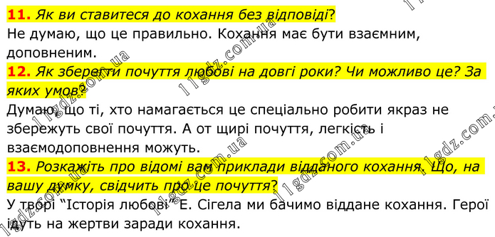 11. Як ви ставитеся до кохання без відповіді? Не думаю, що це правильно. Кохання має бути взаємним, доповненим. 12. Як зберегти почуття любові на довгі роки? Чи можливо це? За яких умов? Думаю, що ті, хто намагається це спеціально робити якраз не збережуть свої почуття. А от щирі почуття, легкість і взаємодоповнення можуть. 13. Розкажіть про відомі вам приклади відданого кохання. Що, на вашу думку, свідчить про це почуття? У творі “Історія любові” Е. Сігела ми бачимо віддане кохання. Герої ідуть на жертви заради кохання.