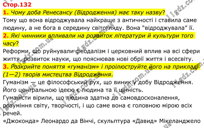 1. Чому доба Ренесансу (Відродження) має таку назву? Тому що вона відроджувала найкраще з античності і ставила саме людину, а не бога в середину світогляду. Вона “відроджувала” її. 2. Які чинники впливали на розвиток літератури й культури того часу? Реформи, що руйнували феодалізм і церковний вплив на всі сфери життя, розвиток науки, що пояснював нові обрії життя і всесвіту. 3. Розкрийте поняття «гуманізм» і проілюструйте його на прикладі (1—2) творів мистецтва Відродження. Гуманізм — це філософський рух, що виник у добу Відродження. Його центральною ідеєю є людина та її цінність. Гуманісти вірили, що людина здатна до самовдосконалення, розуміння світу, творчості, і що саме вона є головною мірою всіх речей. «Джоконда» Леонардо да Вінчі, скульптура «Давид» Мікеланджело.