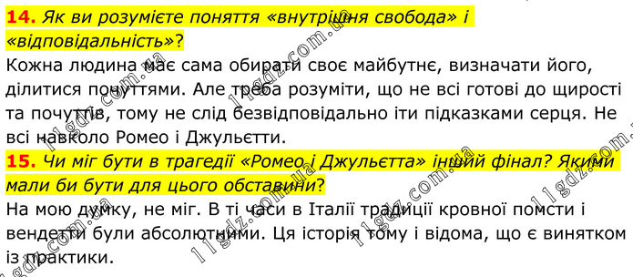 14. Як ви розумієте поняття «внутрішня свобода» і «відповідальність»? Кожна людина має сама обирати своє майбутнє, визначати його, ділитися почуттями. Але треба розуміти, що не всі готові до щирості та почуттів, тому не слід безвідповідально іти підказками серця. Не всі навколо Ромео і Джульєтти. 15. Чи міг бути в трагедії «Ромео і Джульєтта» інший фінал? Якими мали би бути для цього обставини? На мою думку, не міг. В ті часи в Італії традиції кровної помсти і вендетти були абсолютними. Ця історія тому і відома, що є винятком із практики.
