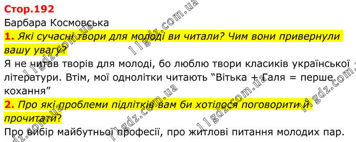 Барбара Космовська 1. Які сучасні твори для молоді ви читали? Чим вони привернули вашу увагу? Я не читав творів для молоді, бо люблю твори класиків української літератури. Втім, мої однолітки читають “Вітька + Галя = перше кохання” 2. Про які проблеми підлітків вам би хотілося поговорити й прочитати? Про вибір майбутньої професії, про житлові питання молодих пар.