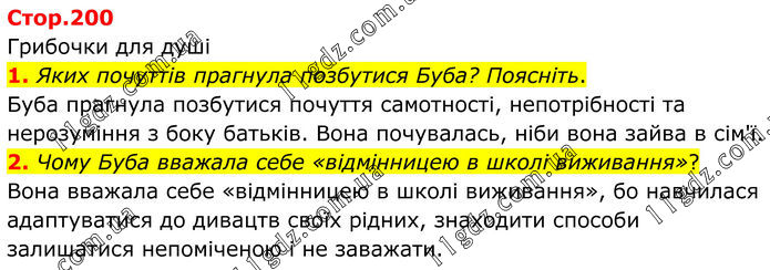 Грибочки для душі 1. Яких почуттів прагнула позбутися Буба? Поясніть. Буба прагнула позбутися почуття самотності, непотрібності та нерозуміння з боку батьків. Вона почувалась, ніби вона зайва в сім'ї. 2. Чому Буба вважала себе «відмінницею в школі виживання»? Вона вважала себе «відмінницею в школі виживання», бо навчилася адаптуватися до дивацтв своїх рідних, знаходити способи залишатися непоміченою і не заважати.