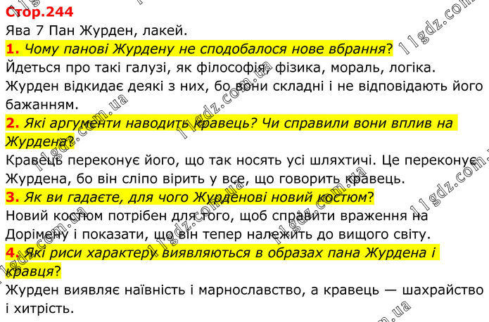 Ява 7 Пан Журден, лакей. 1. Чому панові Журдену не сподобалося нове вбрання? Йдеться про такі галузі, як філософія, фізика, мораль, логіка. Журден відкидає деякі з них, бо вони складні і не відповідають його бажанням. 2. Які аргументи наводить кравець? Чи справили вони вплив на Журдена? Кравець переконує його, що так носять усі шляхтичі. Це переконує Журдена, бо він сліпо вірить у все, що говорить кравець. 3. Як ви гадаєте, для чого Журденові новий костюм? Новий костюм потрібен для того, щоб справити враження на Дорімену і показати, що він тепер належить до вищого світу. 4. Які риси характеру виявляються в образах пана Журдена і кравця? Журден виявляє наївність і марнославство, а кравець — шахрайство і хитрість.