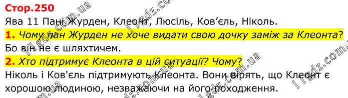 Ява 11 Пані Журден, Клеонт, Люсіль, Ков’єль, Ніколь. 1. Чому пан Журден не хоче видати свою дочку заміж за Клеонта? Бо він не є шляхтичем. 2. Хто підтримує Клеонта в цій ситуації? Чому? Ніколь і Ков'єль підтримують Клеонта. Вони вірять, що Клеонт є хорошою людиною, незважаючи на його походження.