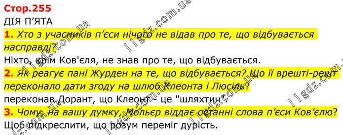 ДІЯ П’ЯТА 1. Хто з учасників п’єси нічого не відав про те, що відбувається насправді? Ніхто, крім Ков'єля, не знав про те, що відбувається. 2. Як реагує пані Журден на те, що відбувається? Що її врешті-решт переконало дати згоду на шлюб Клеонта і Люсіль? переконав Дорант, що Клеонт - це "шляхтич". 3. Чому, на вашу думку, Мольєр віддає останні слова п’єси Ков’єлю? Щоб підкреслити, що розум переміг дурість.