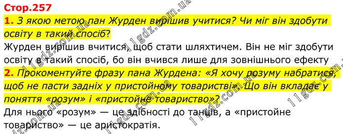 1. З якою метою пан Журден вирішив учитися? Чи міг він здобути освіту в такий спосіб? Журден вирішив вчитися, щоб стати шляхтичем. Він не міг здобути освіту в такий спосіб, бо він вчився лише для зовнішнього ефекту 2. Прокоментуйте фразу пана Журдена: «Я хочу розуму набратися, щоб не пасти задніх у пристойному товаристві». Що він вкладає у поняття «розум» і «пристойне товариство»? Для нього «розум» — це здібності до танців, а «пристойне товариство» — це аристократія.