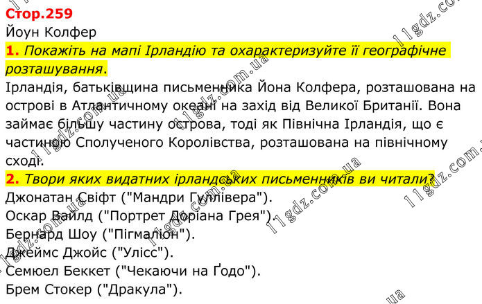 Йоун Колфер 1. Покажіть на мапі Ірландію та охарактеризуйте її географічне розташування. Ірландія, батьківщина письменника Йона Колфера, розташована на острові в Атлантичному океані на захід від Великої Британії. Вона займає більшу частину острова, тоді як Північна Ірландія, що є частиною Сполученого Королівства, розташована на північному сході. 2. Твори яких видатних ірландських письменників ви читали? Джонатан Свіфт ("Мандри Гуллівера"). Оскар Вайлд ("Портрет Доріана Грея"). Бернард Шоу ("Пігмаліон"). Джеймс Джойс ("Улісс"). Семюел Беккет ("Чекаючи на Ґодо"). Брем Стокер ("Дракула").