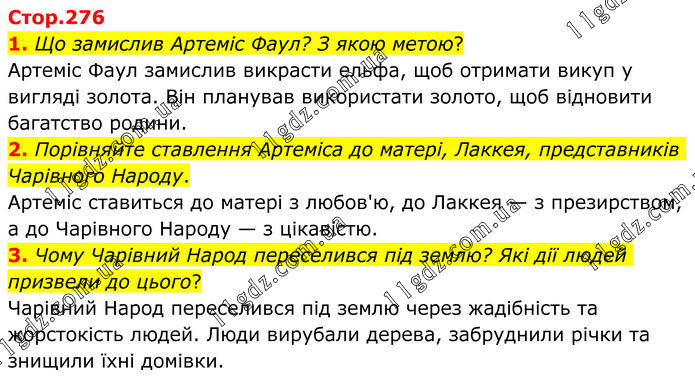1. Що замислив Артеміс Фаул? З якою метою? Артеміс Фаул замислив викрасти ельфа, щоб отримати викуп у вигляді золота. Він планував використати золото, щоб відновити багатство родини. 2. Порівняйте ставлення Артеміса до матері, Лаккея, представників Чарівного Народу. Артеміс ставиться до матері з любов'ю, до Лаккея — з презирством, а до Чарівного Народу — з цікавістю. 3. Чому Чарівний Народ переселився під землю? Які дії людей призвели до цього? Чарівний Народ переселився під землю через жадібність та жорстокість людей. Люди вирубали дерева, забруднили річки та знищили їхні домівки.
