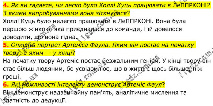 4. Як ви гадаєте, чи легко було Холлі Куць працювати в ЛеППРКОНі? З якими випробуваннями вона зіткнулася? Холлі Куць було нелегко працювати в ЛеППРКОНі. Вона була першою жінкою, яка приєдналася до команди, і їй довелося доводити, що вона гідна. 5. Опишіть портрет Артеміса Фаула. Яким він постає на початку твору, а яким — у кінці? На початку твору Артеміс постає безжальним генієм. У кінці твору він стає більш людяним, бо усвідомлює, що в житті є щось більше, ніж гроші. 6. Які можливості інтелекту демонструє Артеміс Фаул? Він демонструє надзвичайну пам'ять, аналітичне мислення та здатність до дедукції.