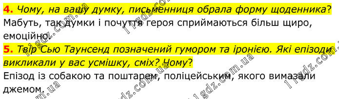4. Чому, на вашу думку, письменниця обрала форму щоденника? Мабуть, так думки і почуття героя сприймаються більш щиро, емоційно. 5. Твір Сью Таунсенд позначений гумором та іронією. Які епізоди викликали у вас усмішку, сміх? Чому? Епізод із собакою та поштарем, поліцейським, якого вимазали джемом.