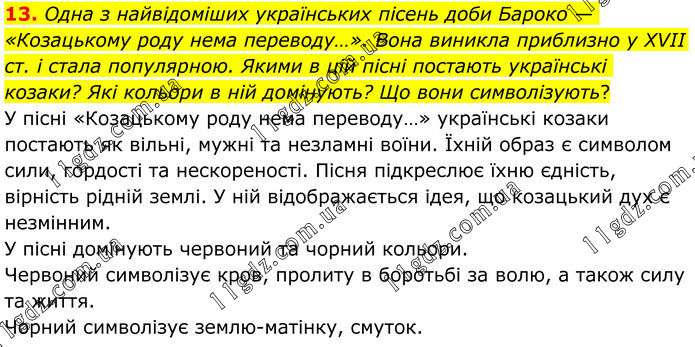 13. Одна з найвідоміших українських пісень доби Бароко — «Козацькому роду нема переводу…». Вона виникла приблизно у XVII ст. і стала популярною. Якими в цій пісні постають українські козаки? Які кольори в ній домінують? Що вони символізують? У пісні «Козацькому роду нема переводу…» українські козаки постають як вільні, мужні та незламні воїни. Їхній образ є символом сили, гордості та нескореності. Пісня підкреслює їхню єдність, вірність рідній землі. У ній відображається ідея, що козацький дух є незмінним. У пісні домінують червоний та чорний кольори. Червоний символізує кров, пролиту в боротьбі за волю, а також силу та життя. Чорний символізує землю-матінку, смуток.