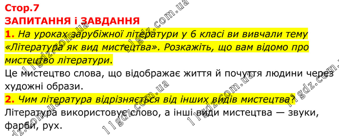 ЗАПИТАННЯ і ЗАВДАННЯ 1. На уроках зарубіжної літератури у 6 класі ви вивчали тему «Література як вид мистецтва». Розкажіть, що вам відомо про мистецтво літератури. Це мистецтво слова, що відображає життя й почуття людини через художні образи. 2. Чим література відрізняється від інших видів мистецтва? Література використовує слово, а інші види мистецтва — звуки, фарби, рух.