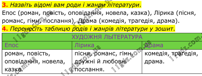 3. Назвіть відомі вам роди і жанри літератури. Епос (роман, повість, оповідання, новела, казка), Лірика (пісня, романс, гімн, послання), Драма (комедія, трагедія, драма). 4. Перенесіть таблицю родів і жанрів літератури у зошит. ХУДОЖНЯ ЛЫТЕРАТУРА Епос Лірика Драма роман, повість, оповідання, новела, казка. пісня, романс, гімн, дружні й любовні послання. комедія, трагедія, драма.