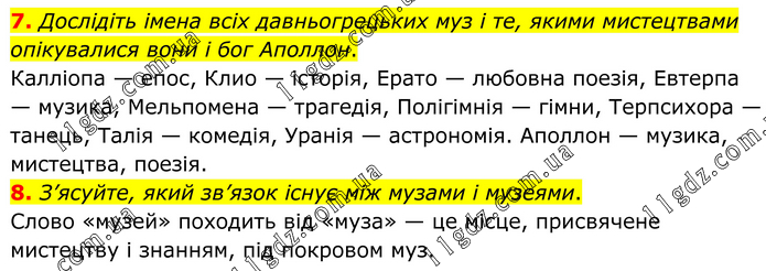 7. Дослідіть імена всіх давньогрецьких муз і те, якими мистецтвами опікувалися вони і бог Аполлон. Калліопа — епос, Клио — історія, Ерато — любовна поезія, Евтерпа — музика, Мельпомена — трагедія, Полігімнія — гімни, Терпсихора — танець, Талія — комедія, Уранія — астрономія. Аполлон — музика, мистецтва, поезія. 8. З’ясуйте, який зв’язок існує між музами і музеями. Слово «музей» походить від «муза» — це місце, присвячене мистецтву і знанням, під покровом муз.