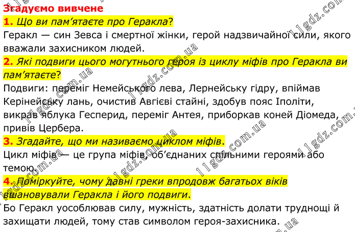 Згадуємо вивчене 1. Що ви пам’ятаєте про Геракла? Геракл — син Зевса і смертної жінки, герой надзвичайної сили, якого вважали захисником людей. 2. Які подвиги цього могутнього героя із циклу міфів про Геракла ви пам’ятаєте? Подвиги: переміг Немейського лева, Лернейську гідру, впіймав Керінейську лань, очистив Авгієві стайні, здобув пояс Іполіти, викрав яблука Гесперид, переміг Антея, приборкав коней Діомеда, привів Цербера. 3. Згадайте, що ми називаємо циклом міфів. Цикл міфів — це група міфів, об’єднаних спільними героями або темою. 4. Поміркуйте, чому давні греки впродовж багатьох віків вшановували Геракла і його подвиги. Бо Геракл уособлював силу, мужність, здатність долати труднощі й захищати людей, тому став символом героя-захисника.