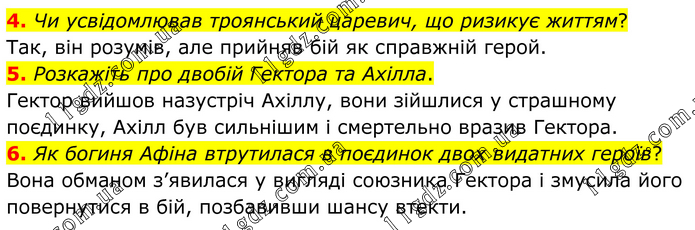 4. Чи усвідомлював троянський царевич, що ризикує життям? Так, він розумів, але прийняв бій як справжній герой. 5. Розкажіть про двобій Гектора та Ахілла. Гектор вийшов назустріч Ахіллу, вони зійшлися у страшному поєдинку, Ахілл був сильнішим і смертельно вразив Гектора. 6. Як богиня Афіна втрутилася в поєдинок двох видатних героїв? Вона обманом з’явилася у вигляді союзника Гектора і змусила його повернутися в бій, позбавивши шансу втекти.