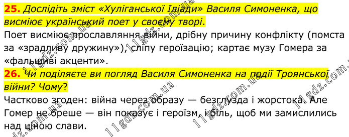 25. Дослідіть зміст «Хуліганської Іліади» Василя Симоненка, що висміює український поет у своєму творі. Поет висміює прославляння війни, дрібну причину конфлікту (помста за «зрадливу дружину»), сліпу героїзацію; картає музу Гомера за «фальшиві акценти». 26. Чи поділяєте ви погляд Василя Симоненка на події Троянської війни? Чому? Частково згоден: війна через образу — безглузда і жорстока. Але Гомер не бреше — він показує і героїзм, і біль, щоб ми замислились над ціною слави.