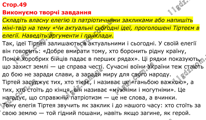 Виконуємо творчі завдання Складіть власну елегію із патріотичними закликами або напишіть міні-твір на тему «Чи актуальні сьогодні ідеї, проголошені Тіртеєм в елегії. Наведіть аргументи і приклади. Так, ідеї Тіртея залишаються актуальними і сьогодні. У своїй елегії він говорить: «Добре вмирати тому, хто боронить рідну країну, Поміж хоробрих бійців падає в перших рядах». Ці рядки показують, що захист землі — це справа честі. Сучасні воїни України теж стають до бою не заради слави, а заради миру для свого народу. Тіртей засуджує тих, хто тікає, і називає це «ганьбою важкою», а тих, хто стоїть до кінця, він називає «мужніми і могутніми». Це нагадує, що справжній патріотизм — це не слова, а вчинки. Тому елегія Тіртея звучить як заклик і до нашого часу: хто стоїть за свою землю — той гідний пошани, навіть якщо загине, як герой.