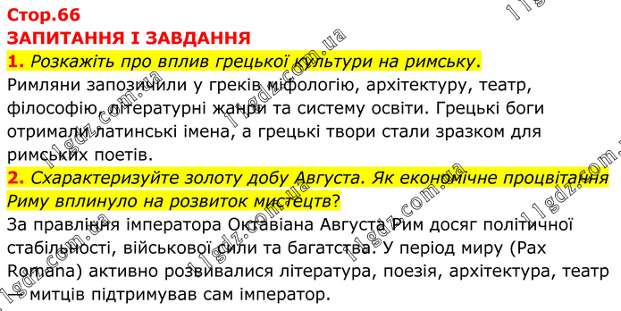 ЗАПИТАННЯ І ЗАВДАННЯ 1. Розкажіть про вплив грецької культури на римську. Римляни запозичили у греків міфологію, архітектуру, театр, філософію, літературні жанри та систему освіти. Грецькі боги отримали латинські імена, а грецькі твори стали зразком для римських поетів. 2. Схарактеризуйте золоту добу Августа. Як економічне процвітання Риму вплинуло на розвиток мистецтв? За правління імператора Октавіана Августа Рим досяг політичної стабільності, військової сили та багатства. У період миру (Pax Romana) активно розвивалися література, поезія, архітектура, театр — митців підтримував сам імператор.