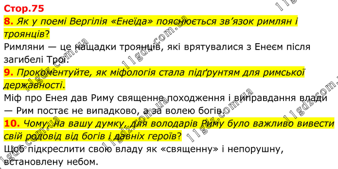 8. Як у поемі Вергілія «Енеїда» пояснюється зв’язок римлян і троянців? Римляни — це нащадки троянців, які врятувалися з Енеєм після загибелі Трої. 9. Прокоментуйте, як міфологія стала підґрунтям для римської державності. Міф про Енея дав Риму священне походження і виправдання влади — Рим постає не випадково, а за волею богів. 10. Чому, на вашу думку, для володарів Риму було важливо вивести свій родовід від богів і давніх героїв? Щоб підкреслити свою владу як «священну» і непорушну, встановлену небом.