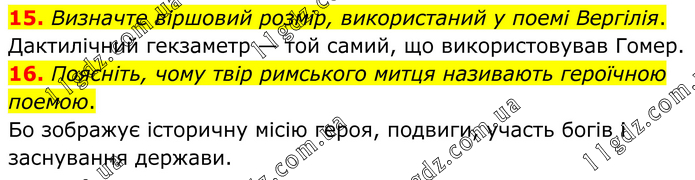15. Визначте віршовий розмір, використаний у поемі Вергілія. Дактилічний гекзаметр — той самий, що використовував Гомер. 16. Поясніть, чому твір римського митця називають героїчною поемою. Бо зображує історичну місію героя, подвиги, участь богів і заснування держави.