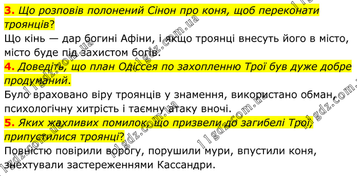 3. Що розповів полонений Сінон про коня, щоб переконати троянців? Що кінь — дар богині Афіни, і якщо троянці внесуть його в місто, місто буде під захистом богів. 4. Доведіть, що план Одіссея по захопленню Трої був дуже добре продуманий. Було враховано віру троянців у знамення, використано обман, психологічну хитрість і таємну атаку вночі. 5. Яких жахливих помилок, що призвели до загибелі Трої, припустилися троянці? Повністю повірили ворогу, порушили мури, впустили коня, знехтували застереженнями Кассандри.
