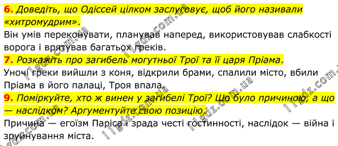 6. Доведіть, що Одіссей цілком заслуговує, щоб його називали «хитромудрим». Він умів переконувати, планував наперед, використовував слабкості ворога і врятував багатьох греків. 7. Розкажіть про загибель могутньої Трої та її царя Пріама. Уночі греки вийшли з коня, відкрили брами, спалили місто, вбили Пріама в його палаці, Троя впала. 9. Поміркуйте, хто ж винен у загибелі Трої? Що було причиною, а що — наслідком? Аргументуйте свою позицію. Причина — егоїзм Паріса і зрада честі гостинності, наслідок — війна і зруйнування міста.
