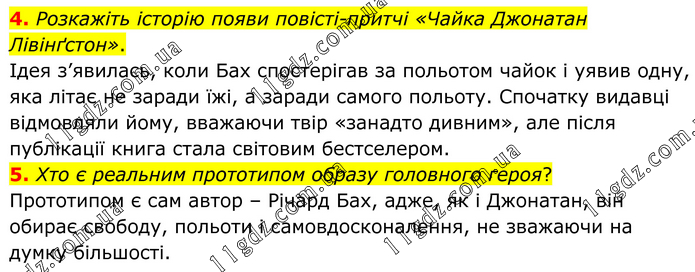 4. Розкажіть історію появи повісті-притчі «Чайка Джонатан Лівінґстон». Ідея з’явилась, коли Бах спостерігав за польотом чайок і уявив одну, яка літає не заради їжі, а заради самого польоту. Спочатку видавці відмовляли йому, вважаючи твір «занадто дивним», але після публікації книга стала світовим бестселером. 5. Хто є реальним прототипом образу головного героя? Прототипом є сам автор – Річард Бах, адже, як і Джонатан, він обирає свободу, польоти і самовдосконалення, не зважаючи на думку більшості.