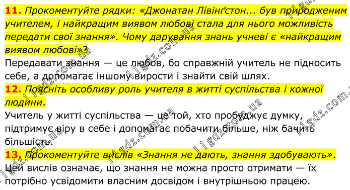 11. Прокоментуйте рядки: «Джонатан Лівінґстон... був природженим учителем, і найкращим виявом любові стала для нього можливість передати свої знання». Чому дарування знань учневі є «найкращим виявом любові»? Передавати знання — це любов, бо справжній учитель не підносить себе, а допомагає іншому вирости і знайти свій шлях. 12. Поясніть особливу роль учителя в житті суспільства і кожної людини. Учитель у житті суспільства — це той, хто пробуджує думку, підтримує віру в себе і допомагає побачити більше, ніж бачить більшість. 13. Прокоментуйте вислів «Знання не дають, знання здобувають». Цей вислів означає, що знання не можна просто отримати — їх потрібно усвідомити власним досвідом і внутрішньою працею.