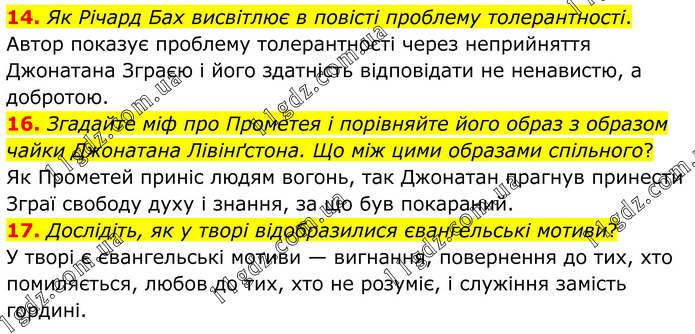 14. Як Річард Бах висвітлює в повісті проблему толерантності. Автор показує проблему толерантності через неприйняття Джонатана Зграєю і його здатність відповідати не ненавистю, а добротою. 16. Згадайте міф про Прометея і порівняйте його образ з образом чайки Джонатана Лівінґстона. Що між цими образами спільного? Як Прометей приніс людям вогонь, так Джонатан прагнув принести Зграї свободу духу і знання, за що був покараний. 17. Дослідіть, як у творі відобразилися євангельські мотиви? У творі є євангельські мотиви — вигнання, повернення до тих, хто помиляється, любов до тих, хто не розуміє, і служіння замість гордині.