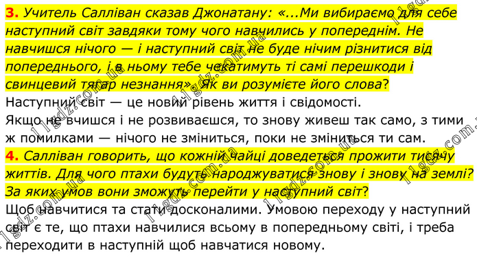 3. Учитель Салліван сказав Джонатану: «...Ми вибираємо для себе наступний світ завдяки тому чого навчились у попереднім. Не навчишся нічого — і наступний світ не буде нічим різнитися від попереднього, і в ньому тебе чекатимуть ті самі перешкоди і свинцевий тягар незнання». Як ви розумієте його слова? Наступний світ — це новий рівень життя і свідомості. Якщо не вчишся і не розвиваєшся, то знову живеш так само, з тими ж помилками — нічого не зміниться, поки не зміниться ти сам. 4. Салліван говорить, що кожній чайці доведеться прожити тисячу життів. Для чого птахи будуть народжуватися знову і знову на землі? За яких умов вони зможуть перейти у наступний світ? Щоб навчитися та стати досконалими. Умовою переходу у наступний світ є те, що птахи навчилися всьому в попередньому світі, і треба переходити в наступній щоб навчатися новому.