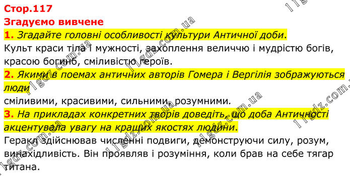 Згадуємо вивчене 1. Згадайте головні особливості культури Античної доби. Культ краси тіла і мужності, захоплення величчю і мудрістю богів, красою богинб, сміливістю героїв. 2. Якими в поемах античних авторів Гомера і Вергілія зображуються люди сміливими, красивими, сильними, розумними. 3. На прикладах конкретних творів доведіть, що доба Античності акцентувала увагу на кращих якостях людини. Геракл здійснював численні подвиги, демонструючи силу, розум, винахідливість. Він проявляв і розуміння, коли брав на себе тягар титана.