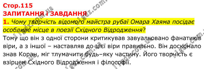 ЗАПИТАННЯ і ЗАВДАННЯ 1. Чому творчість відомого майстра рубаї Омара Хаяма посідає особливе місце в поезії Східного Відродження? Тому що він з одної сторони критикував завуальовано фанатиків віри, а з іншої – наставляв до цієї віри правильно. Він досконало знав Коран, міг тлумачити будь–яку частину. Його творчість є взірцем Східного Відродження і філософії.