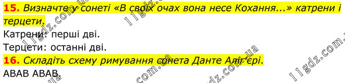 15. Визначте у сонеті «В своїх очах вона несе Кохання...» катрени і терцети. Катрени: перші дві. Терцети: останні дві. 16. Складіть схему римування сонета Данте Аліг’єрі. АВАВ АВАВ.