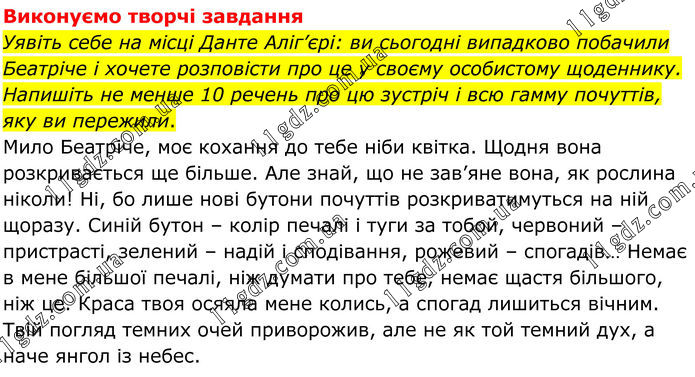Виконуємо творчі завдання Уявіть себе на місці Данте Аліг’єрі: ви сьогодні випадково побачили Беатріче і хочете розповісти про це у своєму особистому щоденнику. Напишіть не менше 10 речень про цю зустріч і всю гамму почуттів, яку ви пережили. Мило Беатріче, моє кохання до тебе ніби квітка. Щодня вона розкривається ще більше. Але знай, що не зав’яне вона, як рослина ніколи! Ні, бо лише нові бутони почуттів розкриватимуться на ній щоразу. Синій бутон – колір печалі і туги за тобой, червоний – пристрасті, зелений – надій і сподівання, рожевий – спогадів… Немає в мене більшої печалі, ніж думати про тебе, немає щастя більшого, ніж це. Краса твоя осяяла мене колись, а спогад лишиться вічним. Твій погляд темних очей приворожив, але не як той темний дух, а наче янгол із небес.
