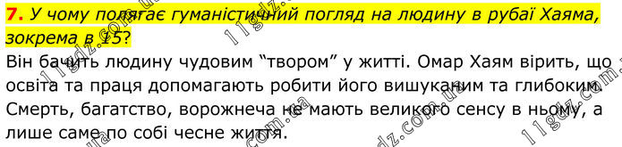 7. У чому полягає гуманістичний погляд на людину в рубаї Хаяма, зокрема в 15? Він бачить людину чудовим “твором” у житті. Омар Хаям вірить, що освіта та праця допомагають робити його вишуканим та глибоким. Смерть, багатство, ворожнеча не мають великого сенсу в ньому, а лише саме по собі чесне життя.