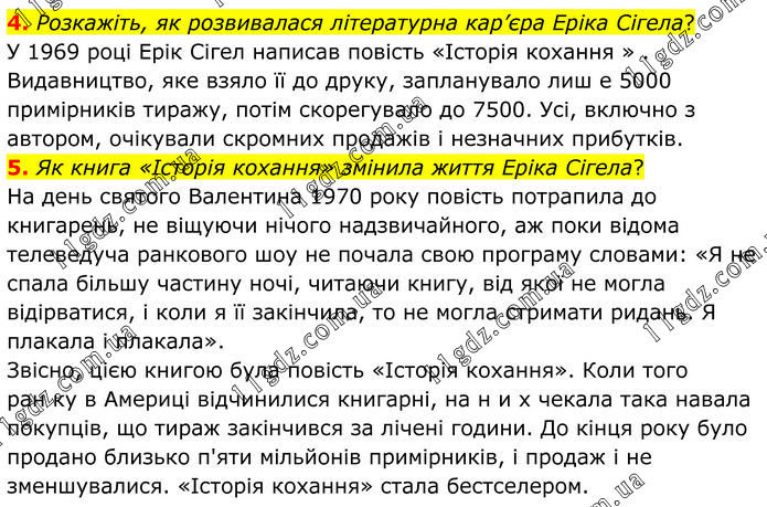 4. Розкажіть, як розвивалася літературна кар’єра Еріка Сігела? У 1969 році Ерік Сігел написав повість «Історія кохання » . Видавництво, яке взяло її до друку, запланувало лиш е 5000 примірників тиражу, потім скорегувало до 7500. Усі, включно з автором, очікували скромних продажів і незначних прибутків. 5. Як книга «Історія кохання» змінила життя Еріка Сігела? На день святого Валентина 1970 року повість потрапила до книгарень, не віщуючи нічого надзвичайного, аж поки відома телеведуча ранкового шоу не почала свою програму словами: «Я не спала більшу частину ночі, читаючи книгу, від якої не могла відірватися, і коли я її закінчила, то не могла стримати ридань. Я плакала і плакала». Звісно, цією книгою була повість «Історія кохання». Коли того ран ку в Америці відчинилися книгарні, на н и х чекала така навала покупців, що тираж закінчився за лічені години. До кінця року було продано близько п'яти мільйонів примірників, і продаж і не зменшувалися. «Історія кохання» стала бестселером.